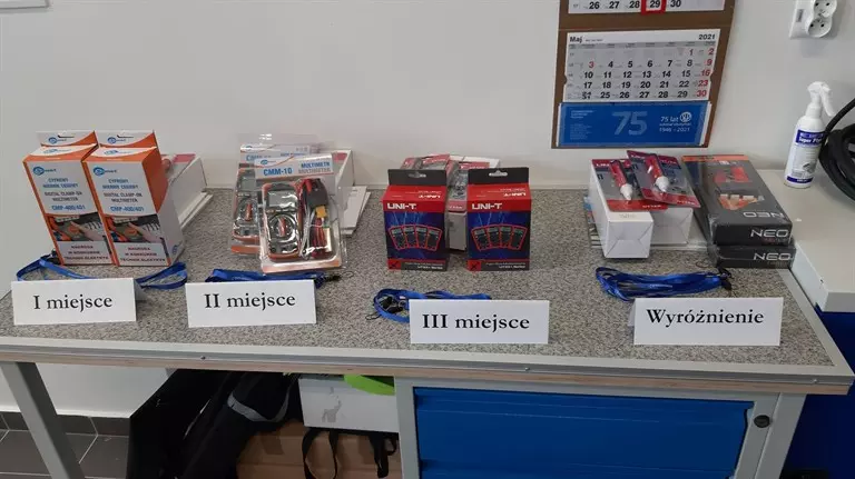 • I miejsce i Złoty Dyplom uzyskała drużyna z Zespołu Szkół Mechaniczno -Energetycznych i Ogólnokształcących nr 5 w Łomży w składzie: Paweł Kryś, Dawid Jastrzębski. Nagrody rzeczowe –cyfrowe mierniki cęgowe CMP-400/401, wskaźnik napięcia UNI-T UT12A, termos oraz upominki reklamowe;
